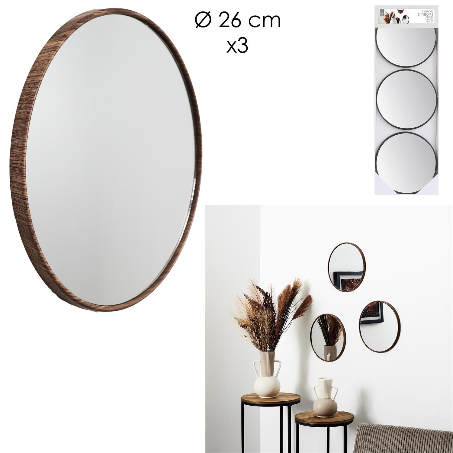 Zestaw trzech okrągłych luster o średnicy 26cm. Lustra wykonane zostały z ramy z tworzywa sztucznego imitującego ciemne drewno orzecha. Zestaw 3 luster idealnych do powieszenia na ścianę w przedpokoju lub poczekalni.Cechy produktu