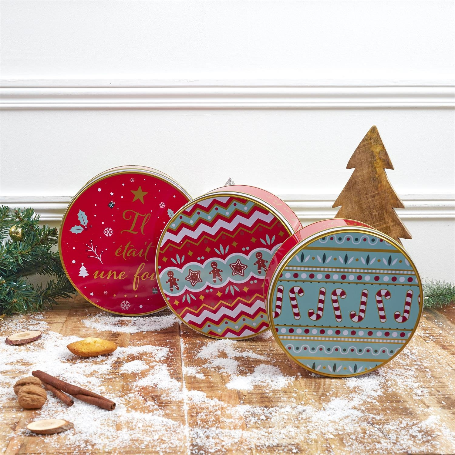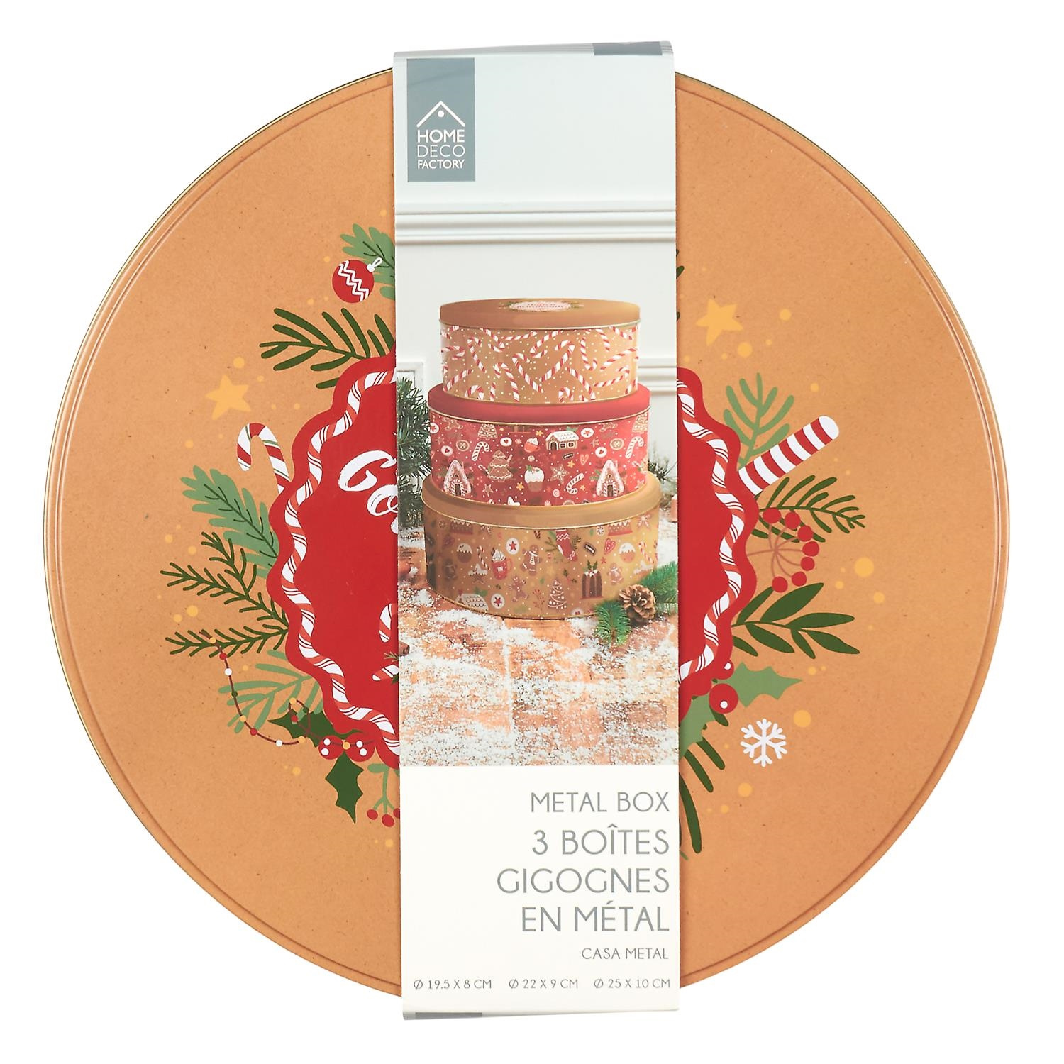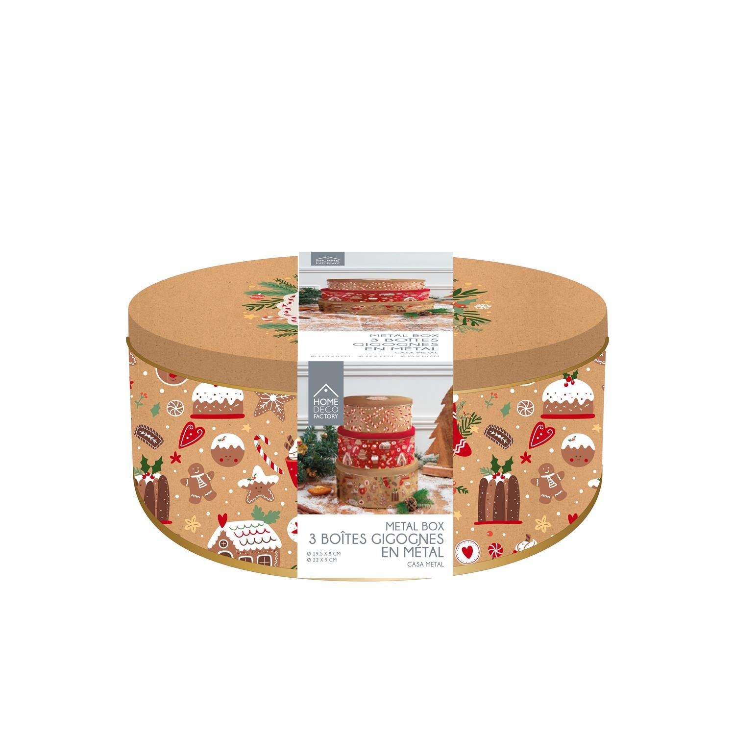 Zestaw trzech metalowych pudełek ze świątecznym wzorem to idealne pojemniki do przechowywania świątecznych pierniczków lub cukierków. Metalowe puszki o walcowatym kształcie wyposażone zostały w pokrywki również z metalu. Dekoracyjną funkcję pojemnikom dodaje świąteczny wzór. Wymiary pudełek: duże wysokość 10cm, średnica 25cm, średnie: wysokość 9cm, średnica 22cm, małe: wysokość 8cm, średnica 19,5cmCechy produktu