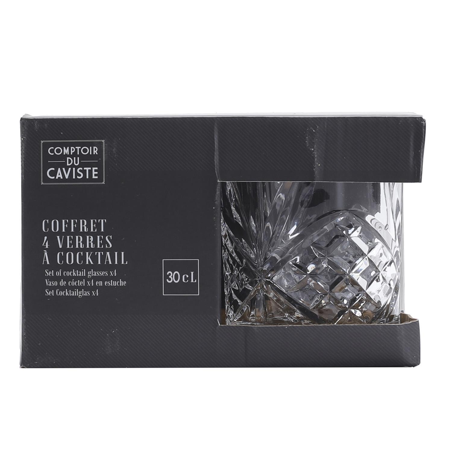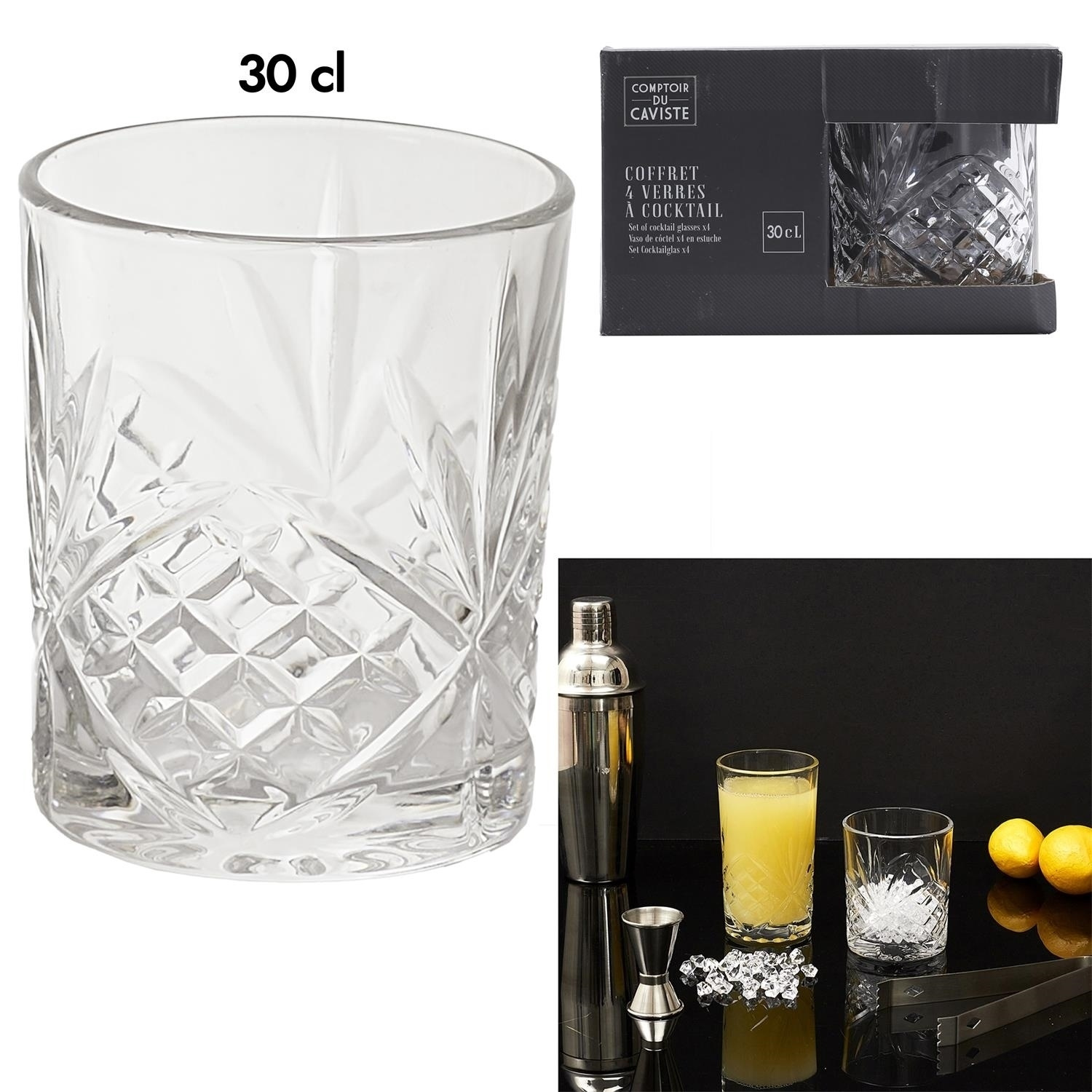 Zestaw 4 szklanek z ozdobnego szkła zrbi wrażenie na nszych gościach. Szkło wyglądające jak ręcznie szlifowane jest niezwykle ozdobne. Szklanki mogą być używane do wody, soków lub kawy na zimno. Można używać w zmywarce. Nie można używać w mikrofalówce. Pojemność jednej szklanki 300 mlCechy produktu