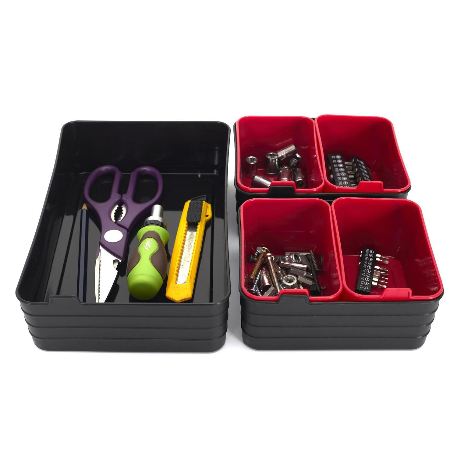 Zestaw organizerów do szuflad lub organizerów do warsztatu. Zestaw zawiera 7 organizerów z tworzywa sztucznego w dwóch kolorach. Pomoga one zorganizować przestrzeń i utrzymać porządek w szufladach lub szafkach. Materiał: polipropylenCechy produktu