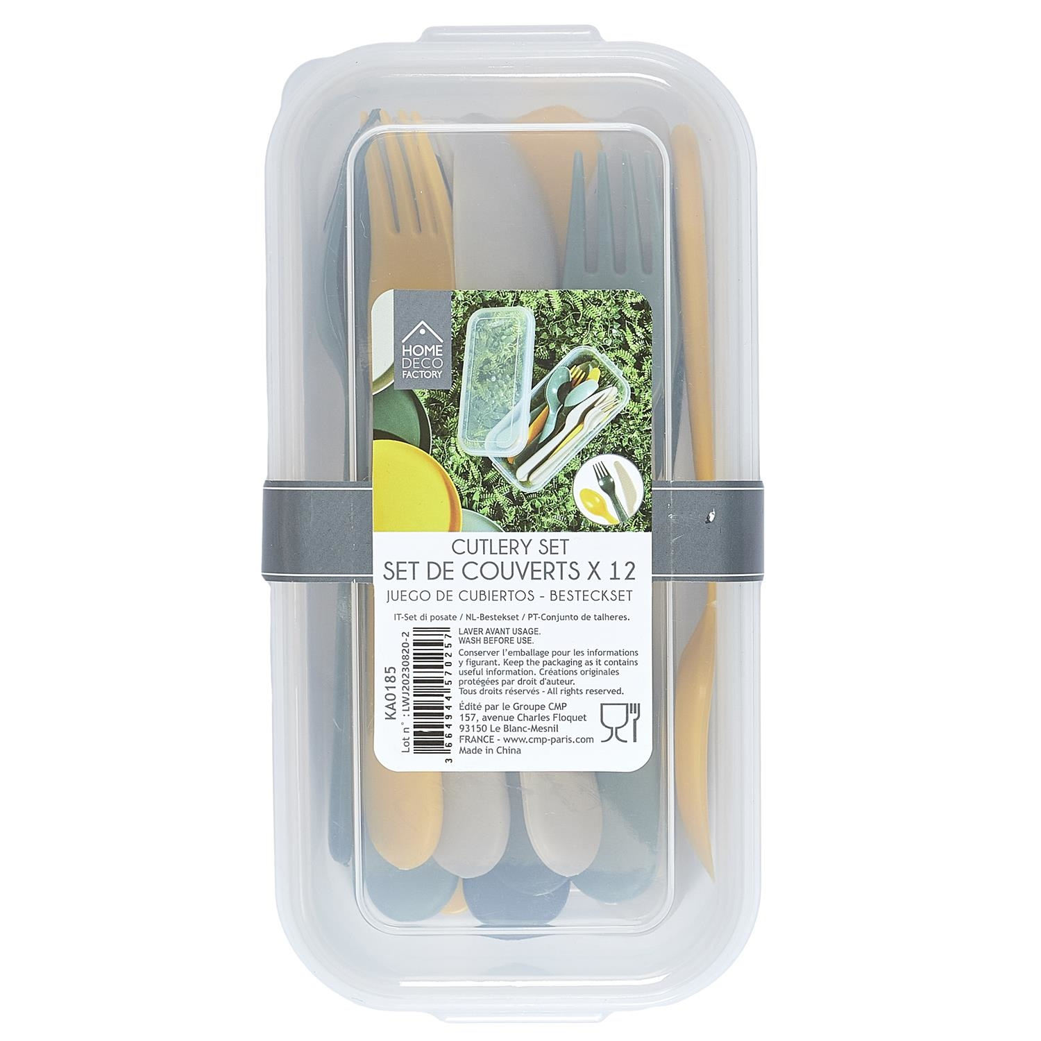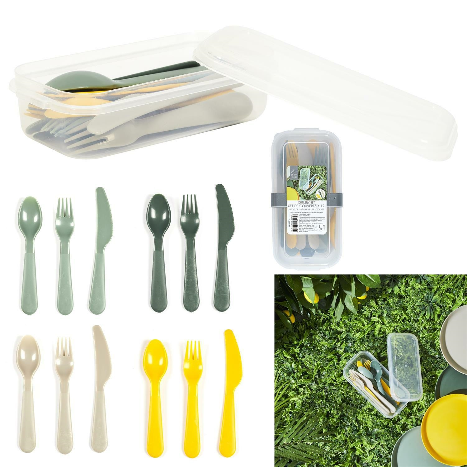 - Zesataw 12 sztućców w 4 kolorach dla 4 osób. Sztućce wykonane z tworzywa sztucznego. W zestawie z plastikowym, transparentnym pudełkiem. Idealne na piknik lub wycieczkę za miasto. Można myć w zmywarce,